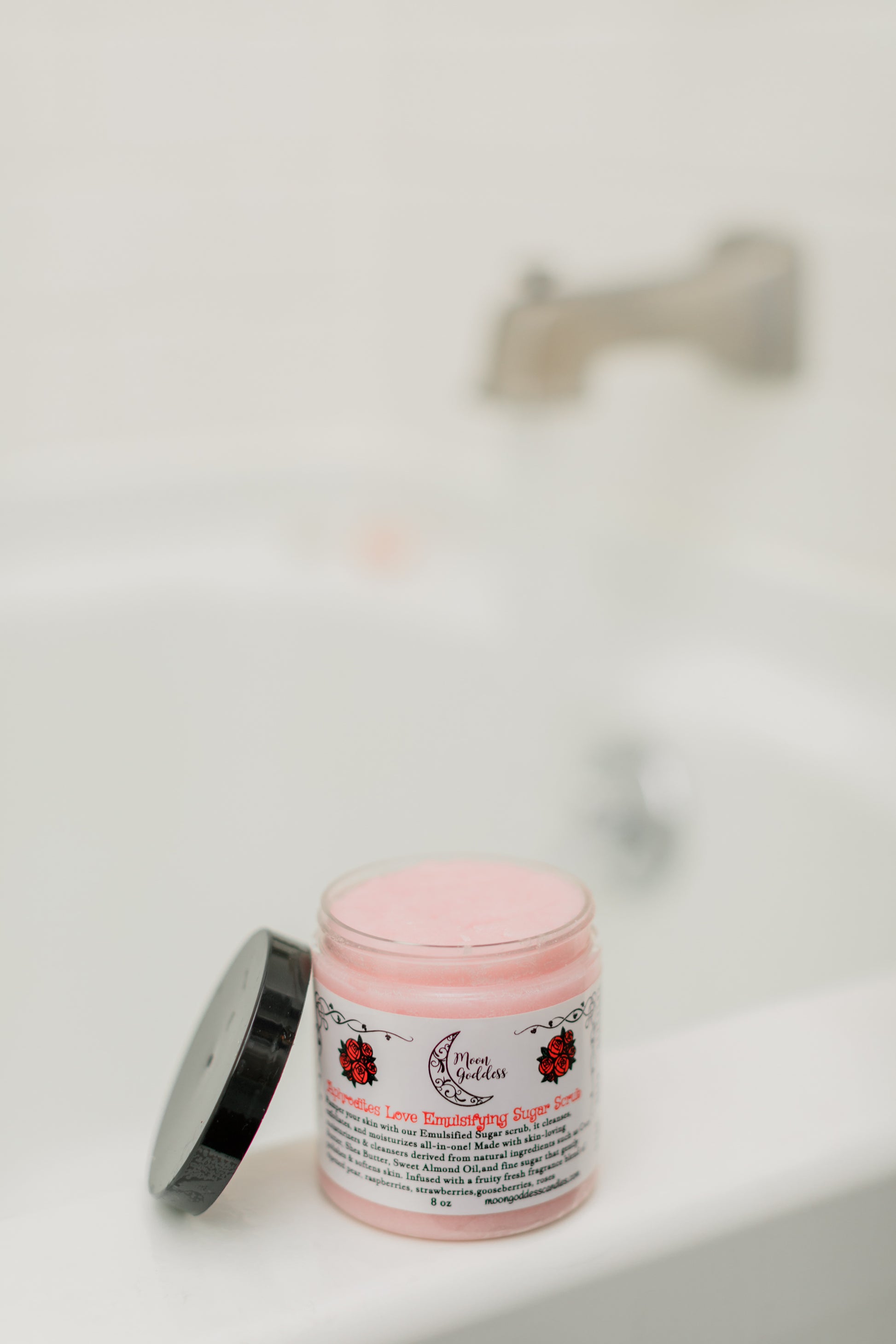 Our Aphrodites Love Emulsifying sugar scrub is packed full of skin loving ingredients, perfect for exfoliation and moisturization! Pamper your skin with our Emulsified Sugar scrub, it cleanses, exfoliates, and moisturizes all-in-one! Made with skin-loving moisturizers & cleansers derived from natural ingredients such as Coco Butter, Shea Butter, Sweet Almond Oil, jojoba oil and fine sugar that gently polishes & softens skin. Infused with a fruity fresh fragrance blend of ripened pear, raspberries, strawberries,gooseberries, roses You'll love the fluffy texture of this whipped Sugar Scrub & your skin will too!