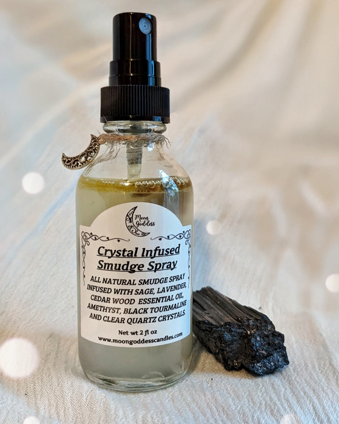 This spray is made with a blend of lavender, sage, and cedar essential oils, infused with lavender, sage leaves, black tourmaline, clear quartz and amethyst chips. The essential oils are known for their calming and uplifting properties, while the crystals are said to promote protection, healing, and balance.