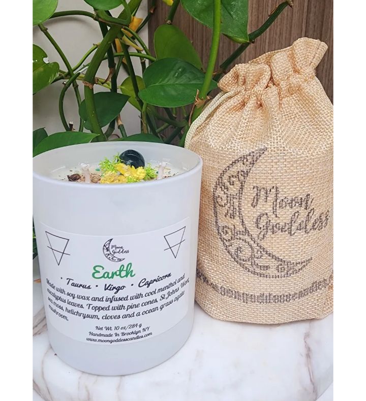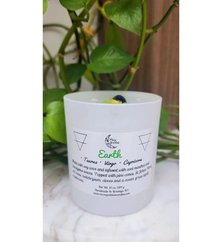 This candle is inspired by the element of Earth which traditionally corresponds to the Zodiac signs of Taurus, Virgo, and Capricorn