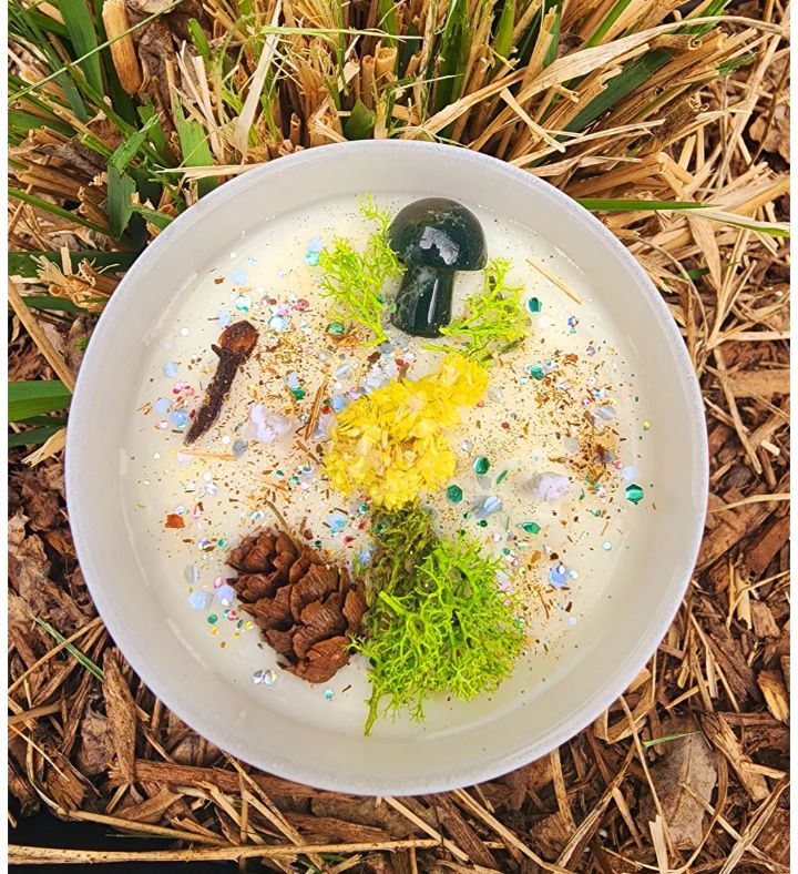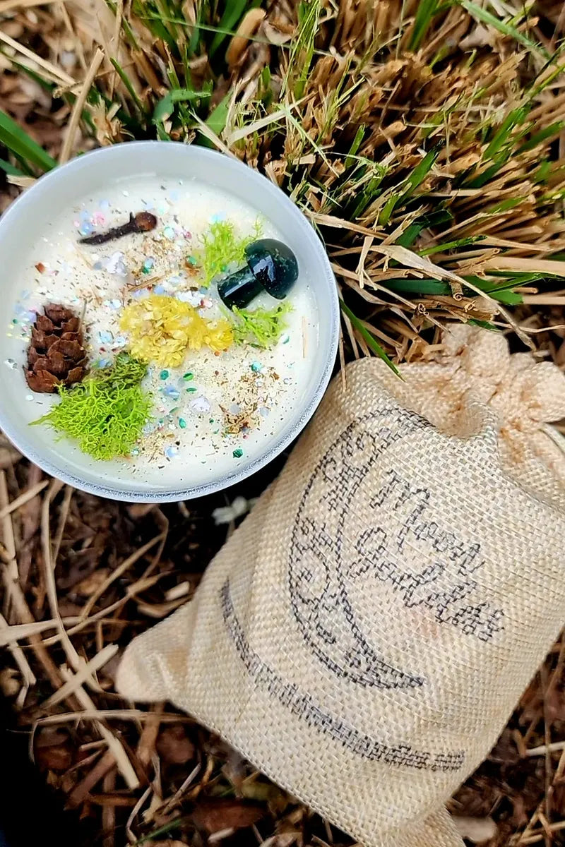 Made with soy wax and infused with cool menthol and eucalyptus leaves. Topped with with pine cones, St Johns Worts, sea moss, helichrysum, cloves and a ocean grass agate mushroom crystal.