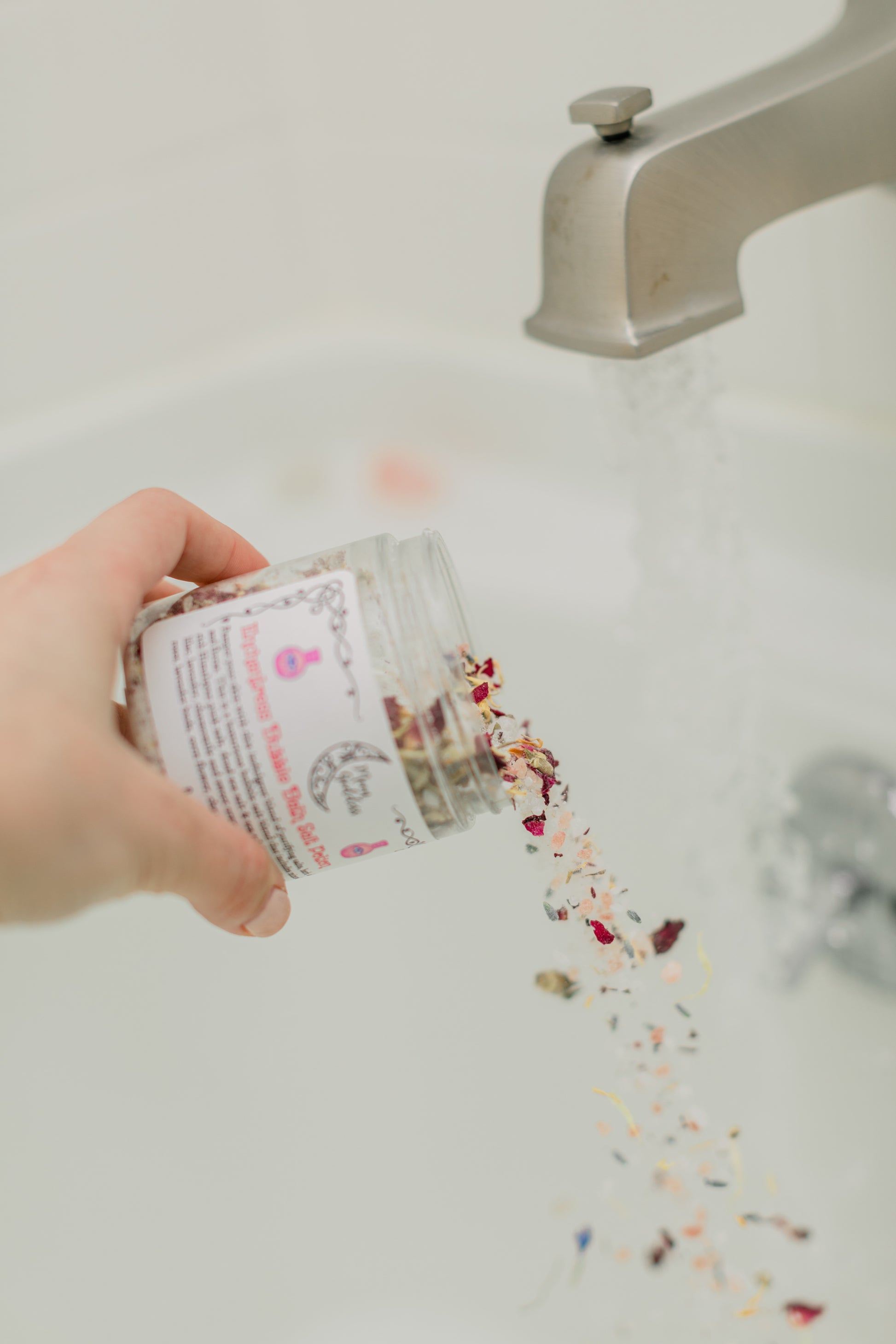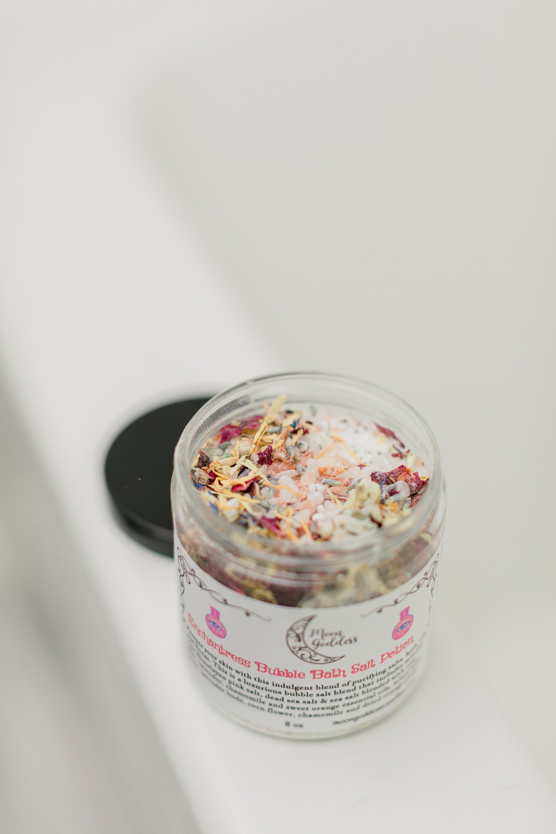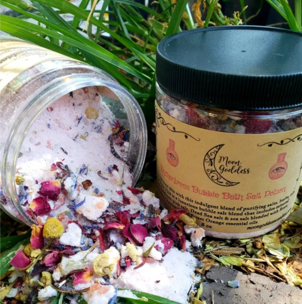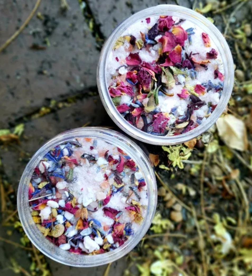 Our new bath salts are crafted to renew, nourish and restore the skin. Blends of salts, oils, herbs and botanical make a lovely self care treat. Pamper your skin with this indulgent blend of purifying salts, herb, oils and floras. This is a luxurious bubble salt blend that includes mineral rich Himalayan pink salt, dead sea salt & sea salt blended with rose, lavender, chamomile and sweet orange essential oils, mixed with roses, lavender buds, corn flower, chamomile and dried orange peels.