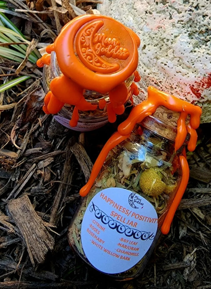 Made with a mixture of herbs that promote positivity and citrine crystals, then wax sealed with orange wax which correspondences to bringing Happiness, Positivity & a calm life.