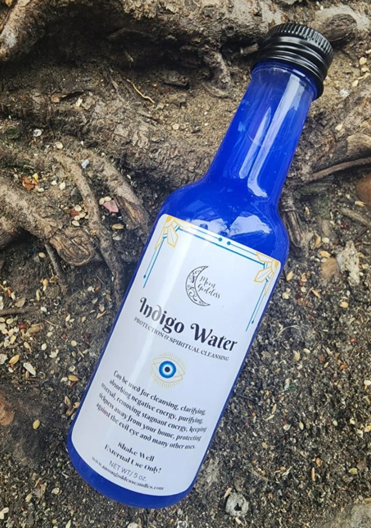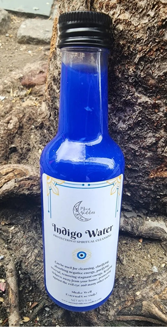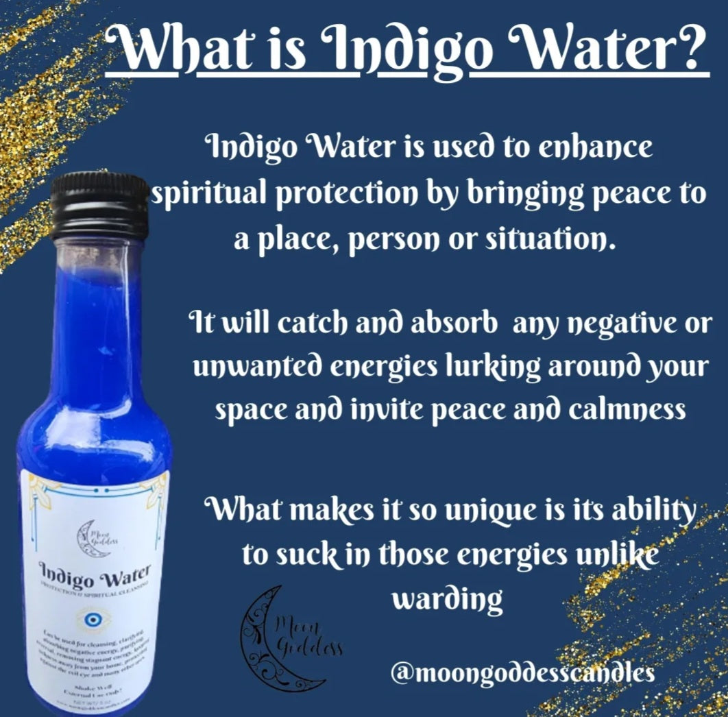 Indigo water is used to enhance spiritual protection by bringing peace to a person, place or situation. It is a good all purpose cleanser to remove general bad vibes to malicious spiritual influence.
