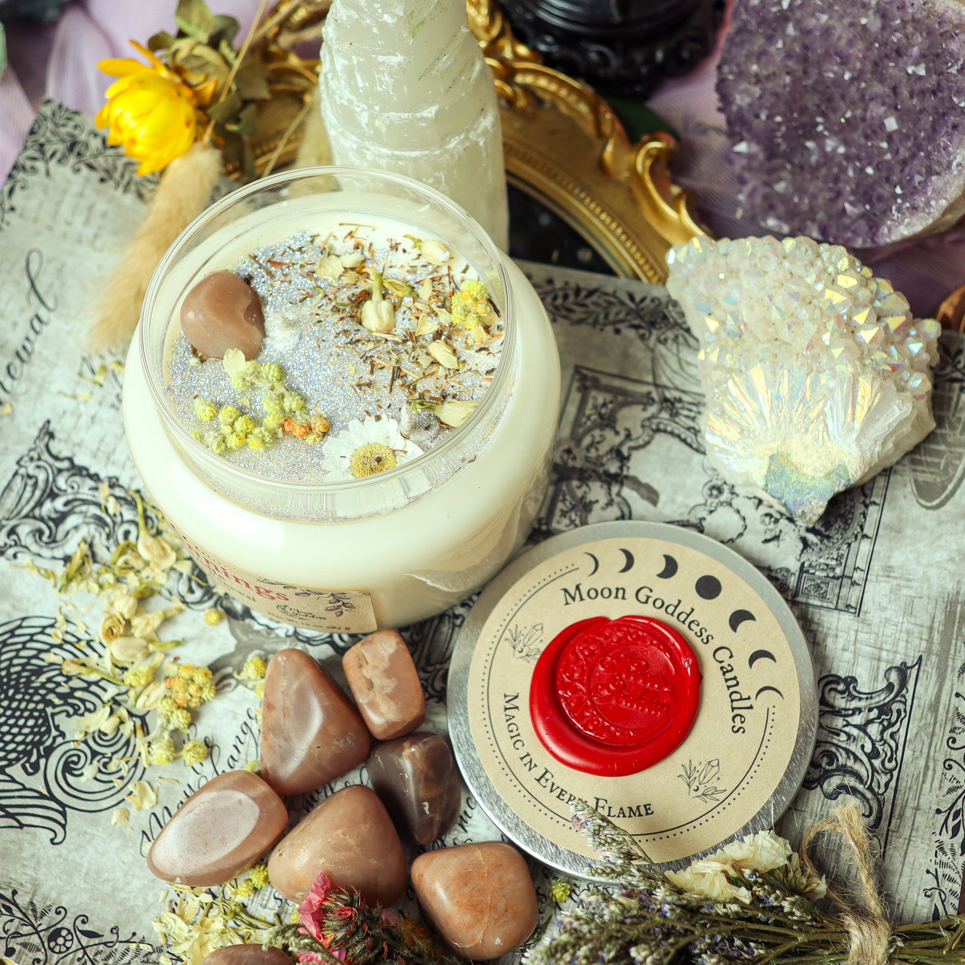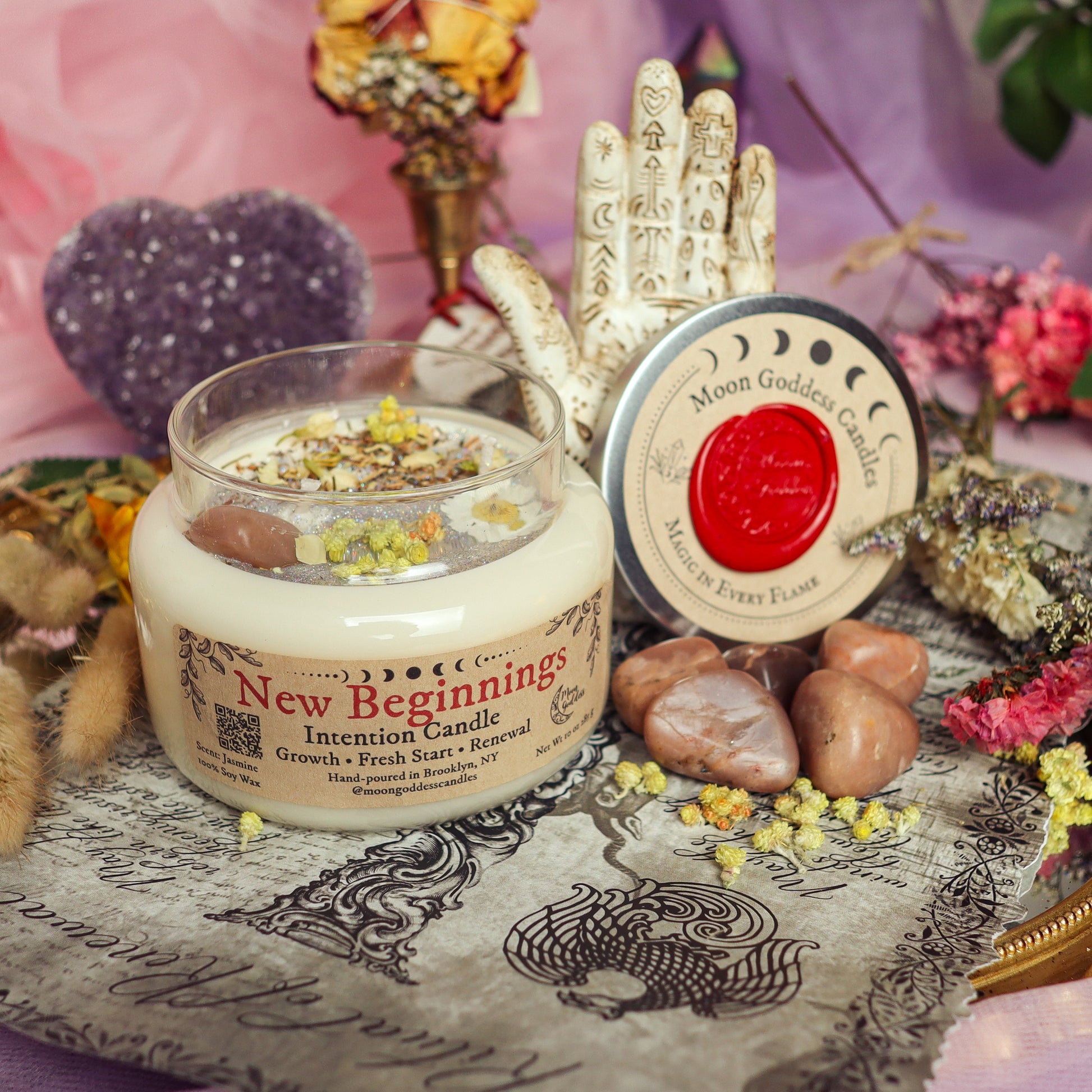 These New beginning candles are intended to bring a new chapter in your life, when old doors close new ones are soon to open. This candle is a great positive energy accessory for anyone that is in transition of a new start whether its letting go of an old relationship, job or just needs a fresh start. As the candle burns, the energy of the moonstone is released, creating a serene and uplifting atmosphere. As you breath in the soothing scent, focus on your intentions for new beginnings and visualize positive changes taking into place