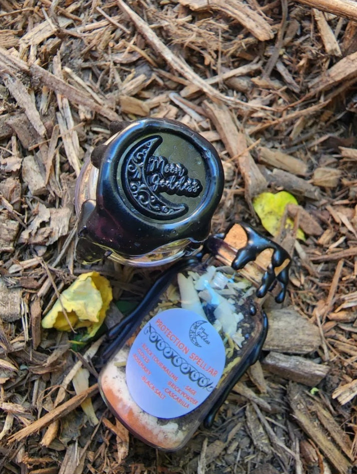 This jar has been made with a custom mix of herbs, brick powder, cascarilla, black salt & black tourmaline, all related towards protection, repelling negativity, then wax sealed with black wax which correspondences to releasing negative energy, reversals + banishing