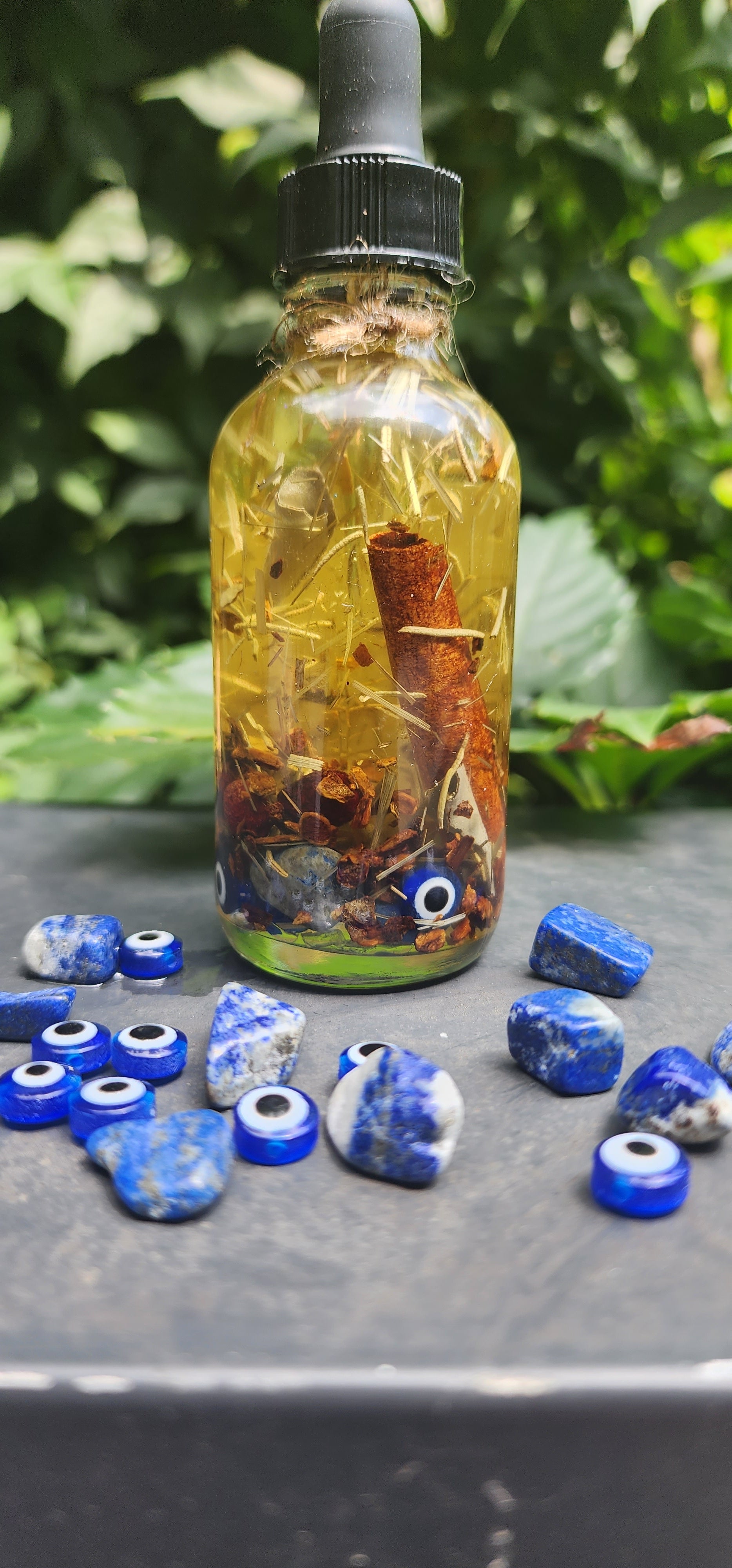 Infused with the enchanting essence of amber oud, camphor, sage, and Palo Santo essential oil, this mystical elixir creates an aura of defense. The fusion of cascara sagrada, sage, lemongrass, rosemary, cloves, and cinnamon infuse the oil with a sense of ancient wisdom and purifying energy. Enhanced with the vibrational forces of lapis lazuli, Evil eye beads and clear quartz, this oil forms an impenetrable barrier, while simultaneously promoting inner clarity and balance. Ward off malevolent energies and cultivate a protective sanctuary with every drop of our Evil Eye Protection Oil.