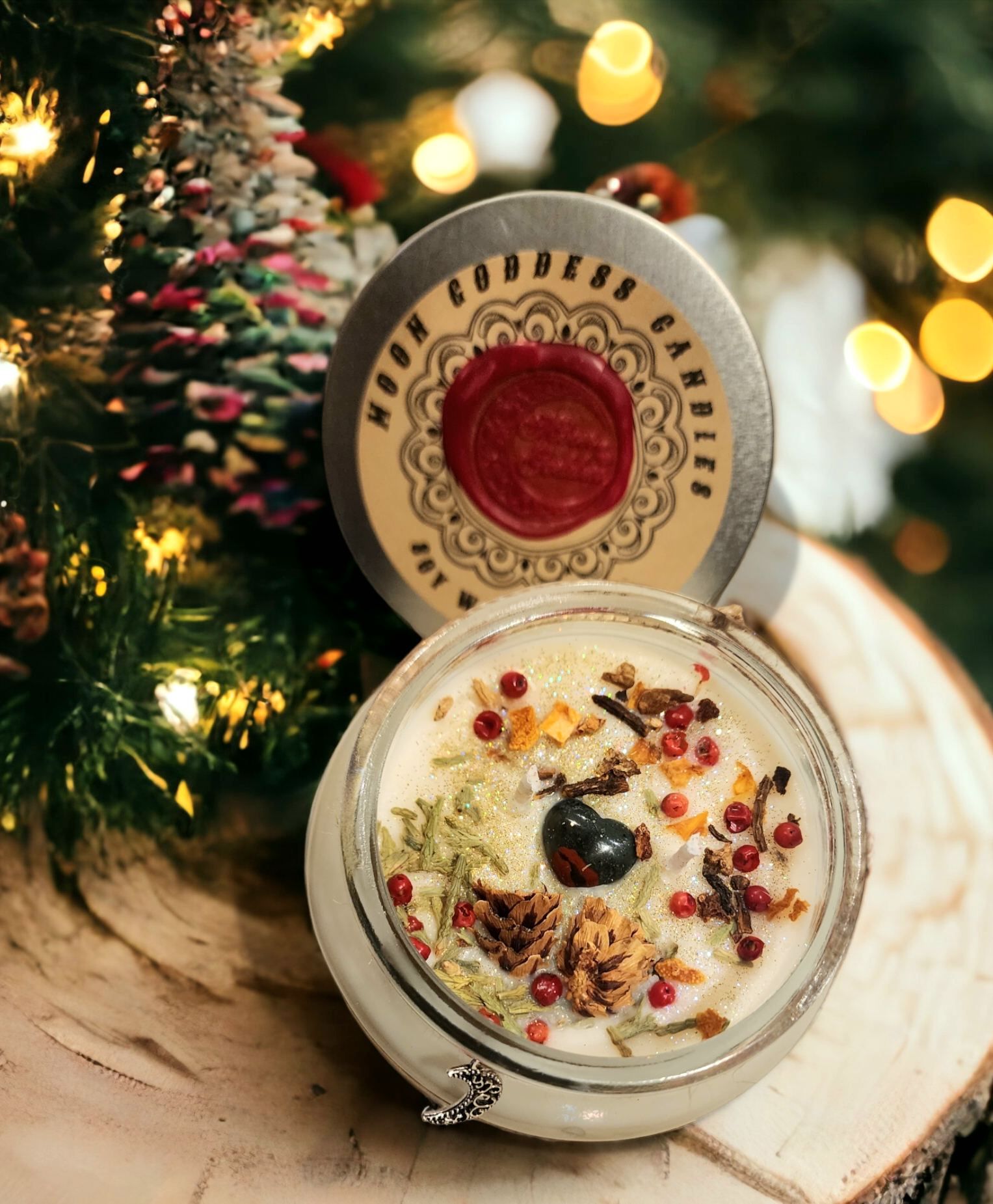 A rich combination of green apple, clove buds and red hot cinnamon creates a traditional, nostalgic scent loved by many. Topped with mistletoe, orange peel, peppercorn, mini pinecones, cedar leaves and a fully charged Bloodstone.